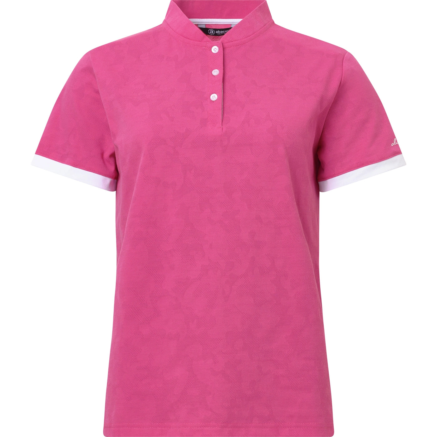 Ceriserosa topp med söt kinakrage och jaquardstickat mönster. Crystal polo är gjord i ett mjukt och stretchigt material med Drycool och andningsfunktioner. Lite lösare passform. Vit kontrast i knäppning, kroppsbotten och ärmslut. Abacus-logga på höger ärm och baktill i nacken under kragen.